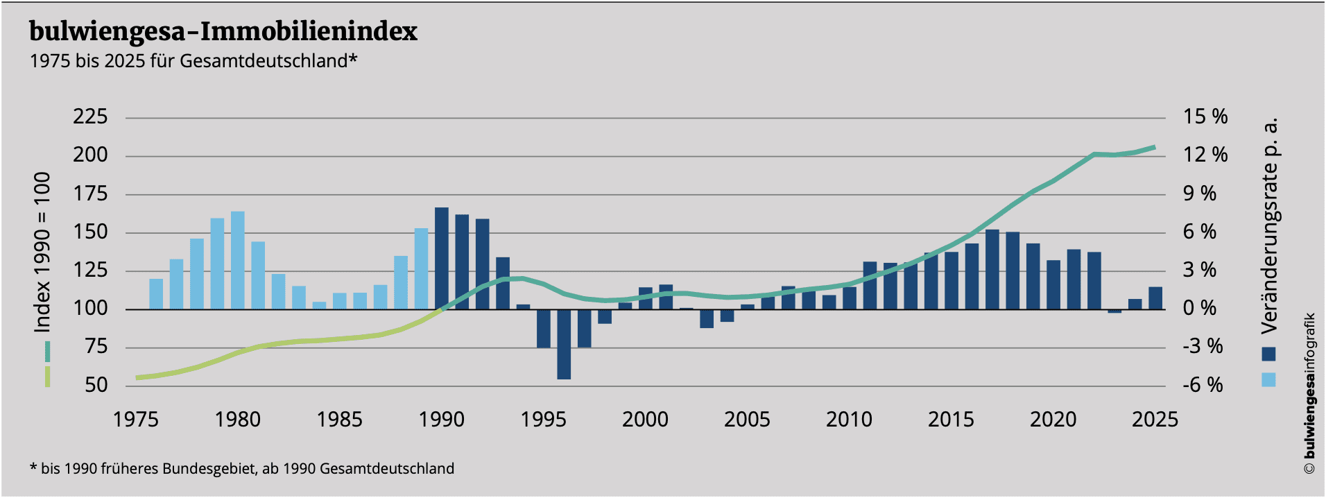 For the 50th time in a row, bulwiengesa presents the real estate index, which analyses the development of real estate prices and rents in Germany since 1975. After difficult previous years, the index recorded a recovery for 2025 with a nominal increase of 1.8%. Nevertheless, the industry remains cautiously cautious: high construction costs, low completion figures and hesitant investment decisions define a still fragile market environment.