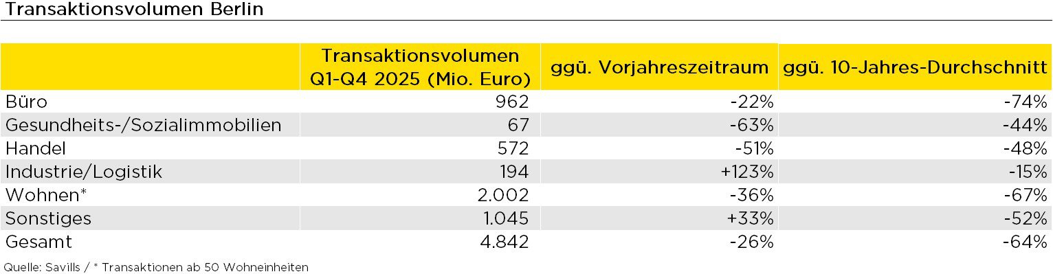 According to Savills, around 4.8 billion euros were turned over in the Berlin real estate investment market in 2025. Compared to the previous year, this corresponds to a decrease of 26%. Compared to the 10-year average, sales were even 64% lower. In the last twelve months, Savills has registered just under 80 transactions, an increase of 11% compared to the previous year. Prime yields for offices and commercial buildings were 4.4% each at the end of December. The prime yield on commercial buildings is thus unchanged from the previous quarter and also unchanged from the previous year’s figure, while the prime yield on offices fell 10 basis points compared to the same quarter last year.