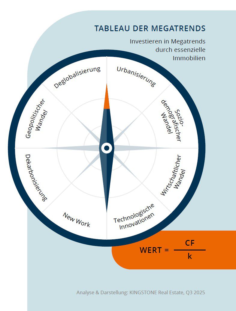 Geopolitische Risiken sind längst keine Randnotiz institutioneller Investmentstrategien mehr – sie sind zum zentralen Navigationspunkt geworden. Unser Puzzletableau der Megatrends zeigt: Der geopolitische Wandel markiert den „Norden“ eines strategischen Kompasses, an dem sich auch Immobilieninvestoren zunehmend orientieren müssen. Dekarbonisierung, technologische Innovation, Urbanisierung und der demografische Wandel bleiben wichtige Treiber – doch in Zeiten von Krieg, Handelskonflikten und einer bremsenden Weltwirtschaft wird Versorgungssicherheit zur zentralen Währung.