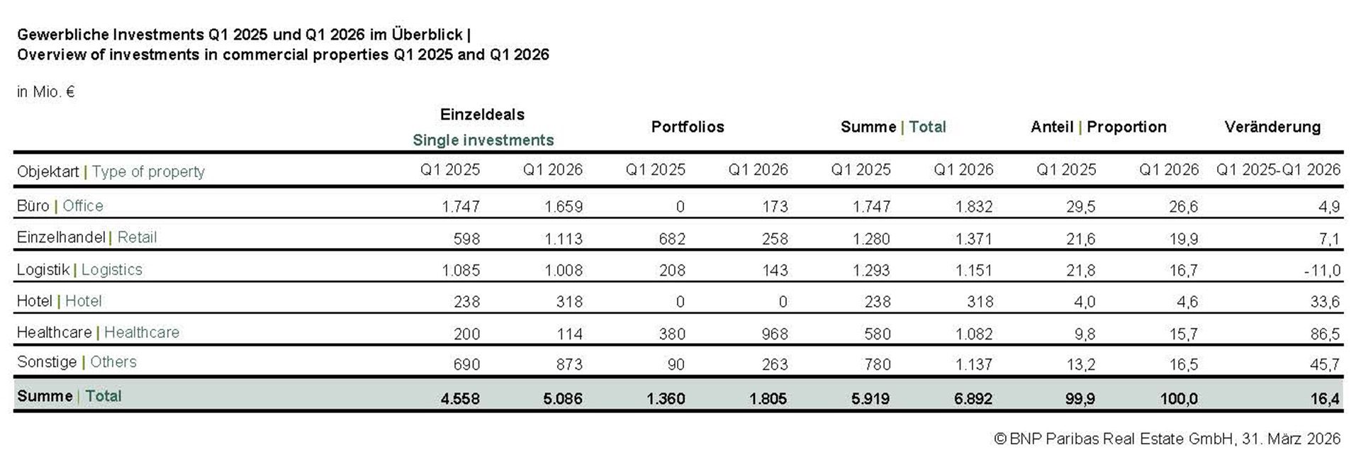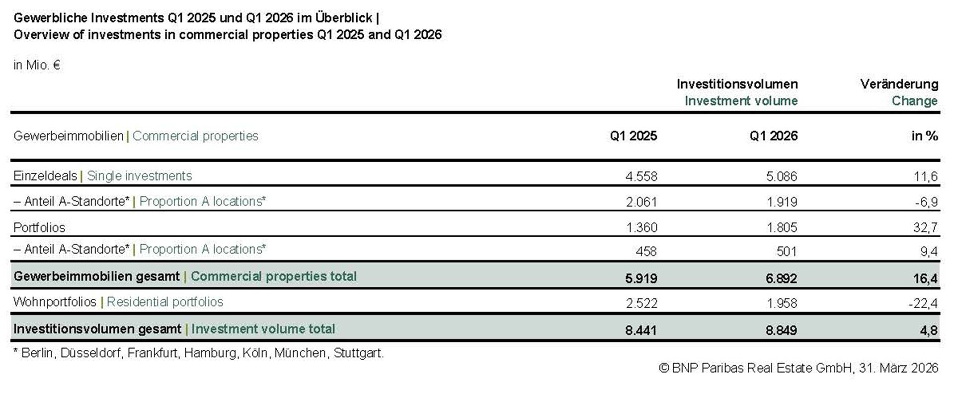 - 74 % (5,1 Mrd. €) des gewerblichen Umsatzes entfallen auf Einzeldeals, Portfolioverkäufe kommen auf 1,8 Mrd. €