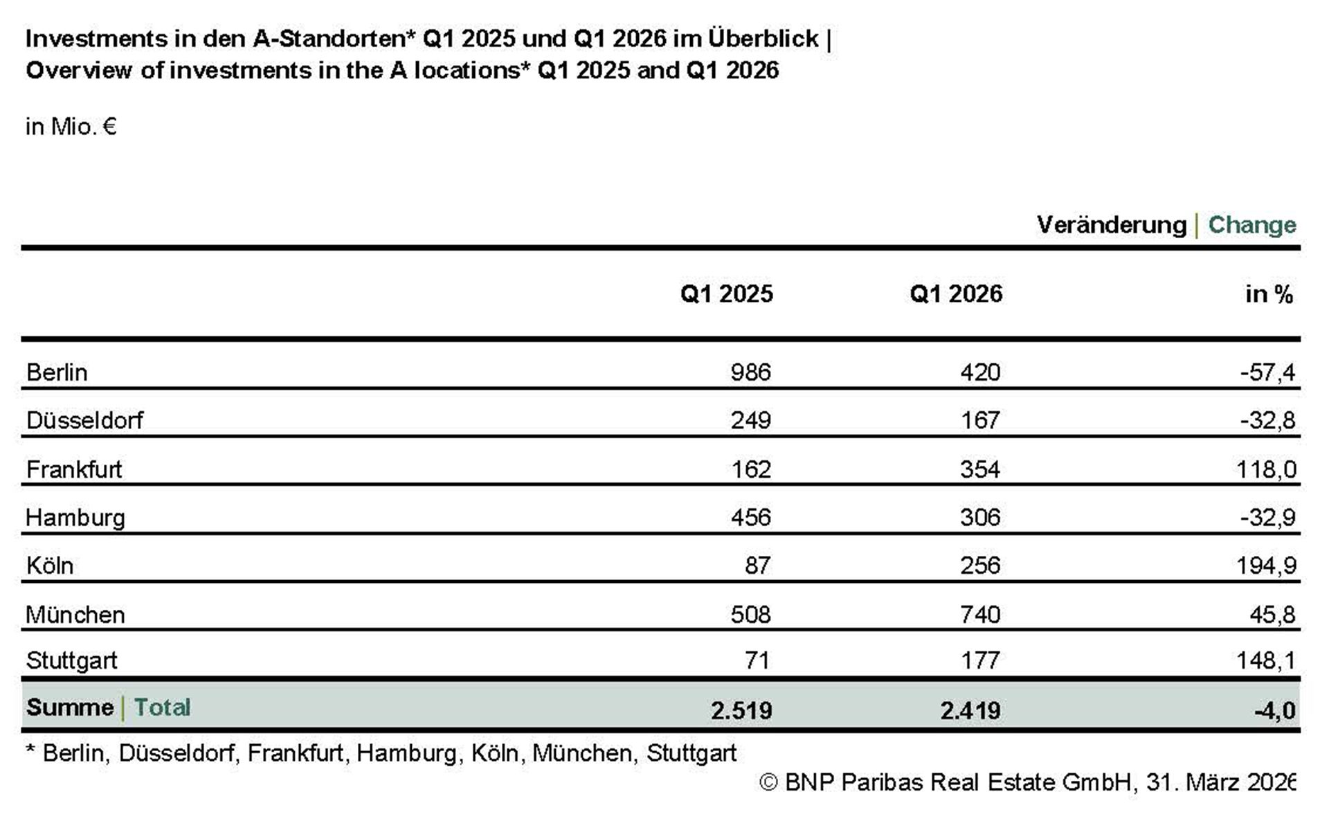 BNP Paribas Real Estate veröffentlicht Investmentzahlen für Q1 2026