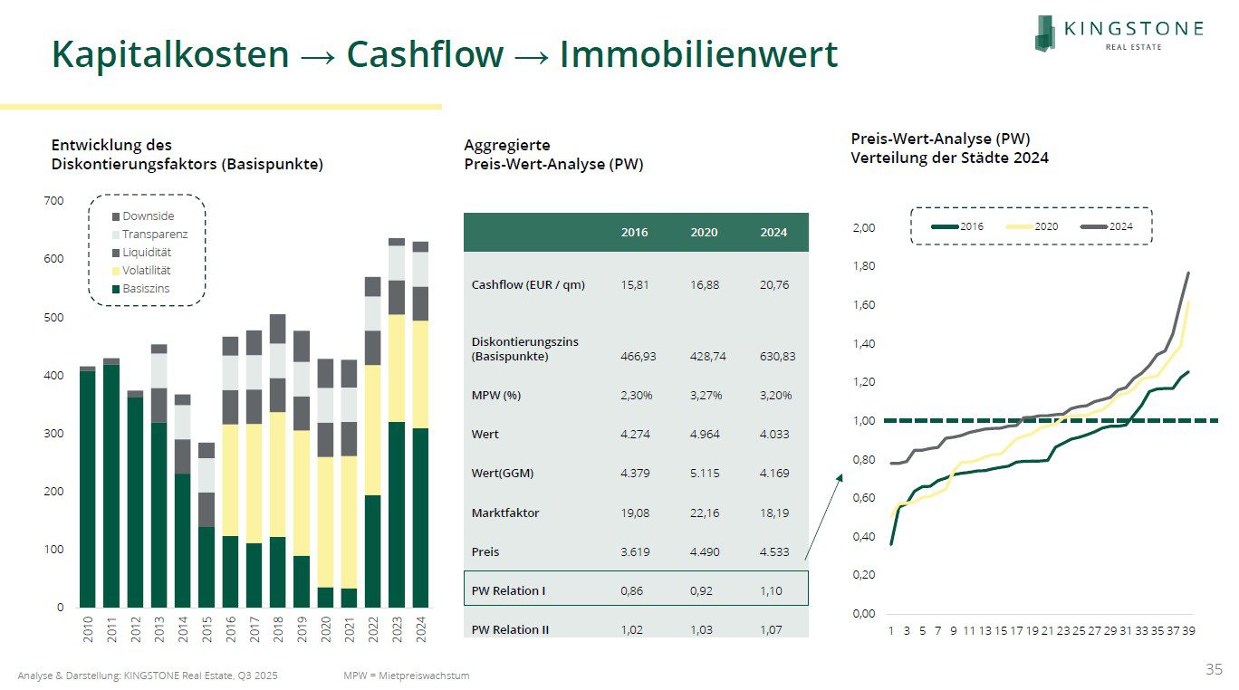 Falling interest rates drove values up, rising interest rates bring them back into balance. Support rent increases, push down higher equity costs. The price-to-value ratio of many markets is normalizing – fundamental analysis is making a comeback.