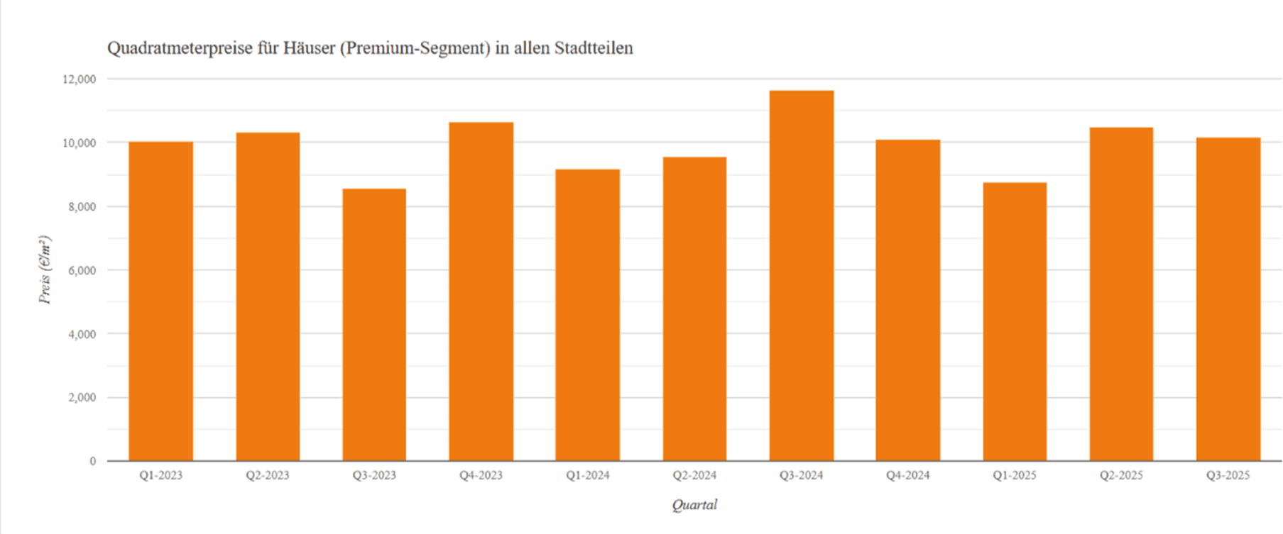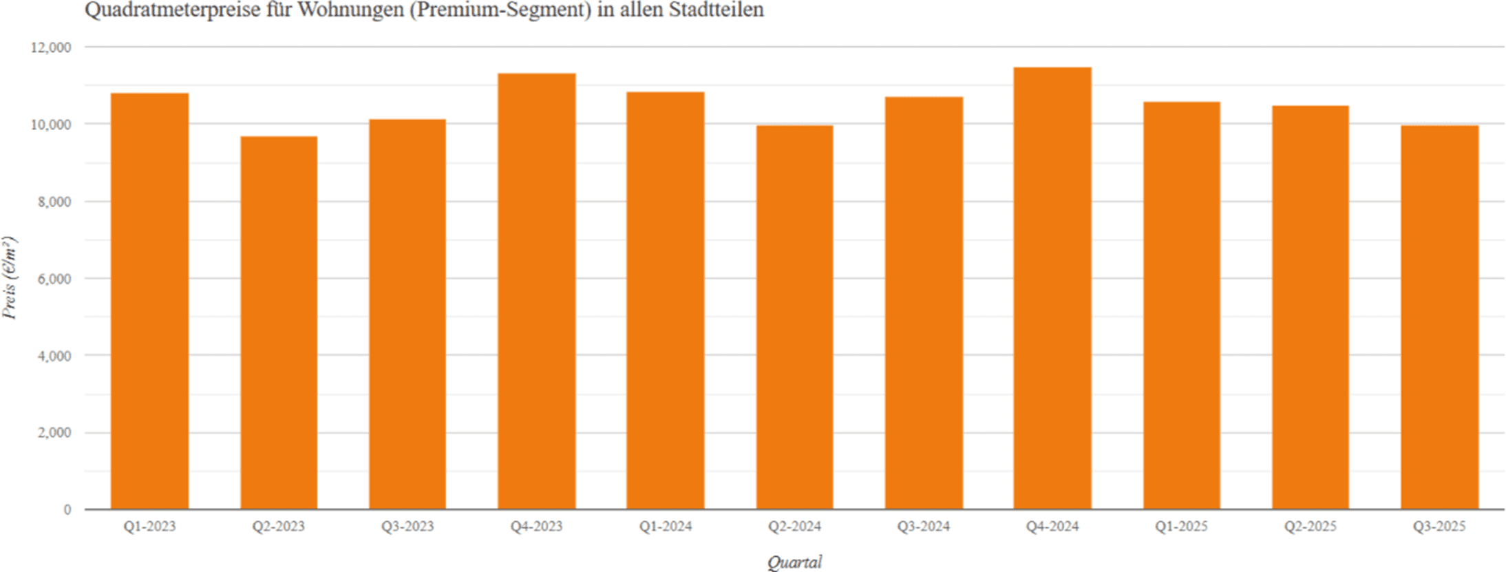 In the premium apartments segment – defined from a price per square metre of around €8,922 – a classic picture emerges for a market on hold. The number of advertisements rose slightly by 4.3% in the third quarter of 2025 compared with the previous quarter. Prices fell by a median of 4.8% to €9,977/m².