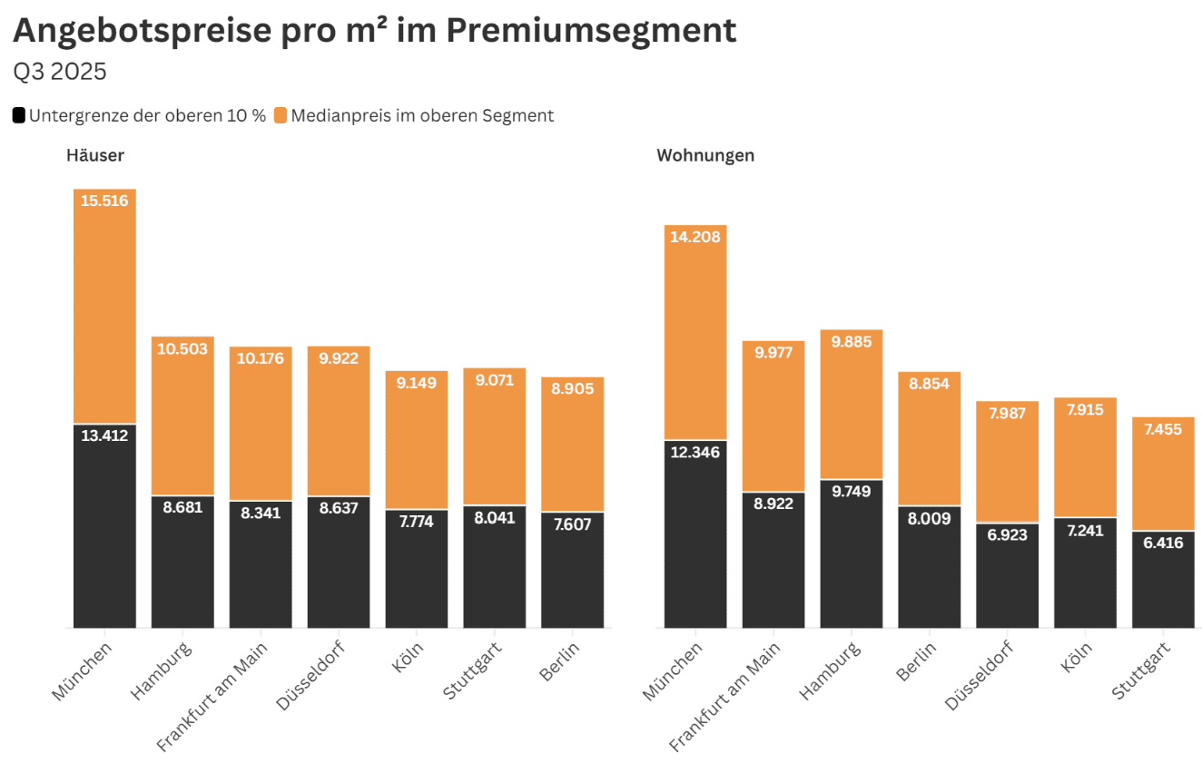 In the analysis of all premium house markets in the top 7 cities, the median asking price fell slightly (-0.3% compared to Q2-2025). As in the previous quarter, the highest price in Q3-2025 was in Munich. Here, a median asking price of €15,516/m² was determined (-6.8