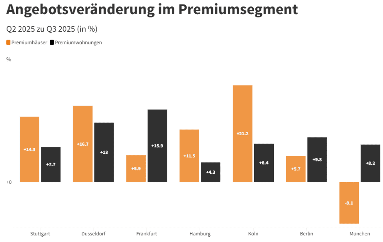 Similar to the housing market, there was also a clear development in the housing segment: Across all top 7 cities, the number of advertised premium houses increased by 11.9% compared to the second quarter of 2025. The most dynamic increase in supply was recorded in Cologne (+21.2%, Q2-2025 compared to Q3-2025), while the smallest increase was recorded in Berlin (+5.7%, Q2-2025 compared to Q3-2025). Only in Munich was there a decline of 9.1%.