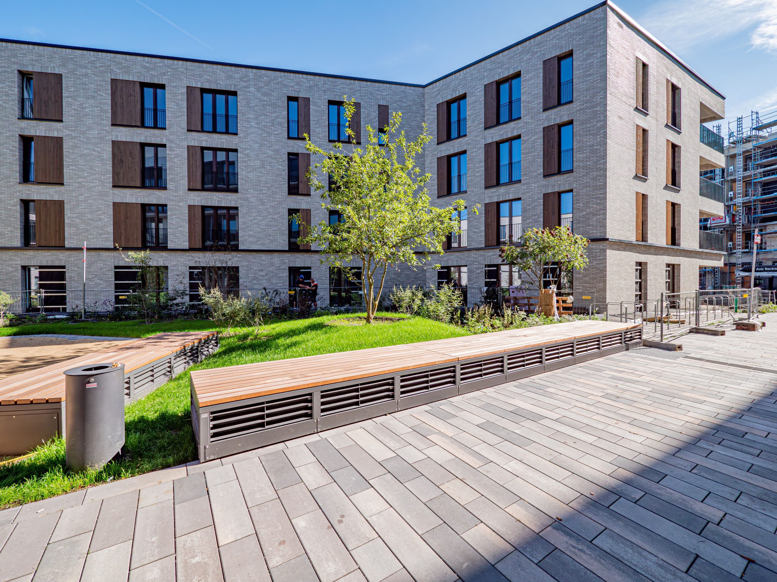 With six buildings, a diverse mix of uses and a total rental area of around 49,000 square metres, the “Deiker Höfe” are being created as a lively, urban quarter. The heart of the ensemble is the residential part with a total of 353 apartments on around 27,340 square metres – including 153 subsidised and price-controlled units that make an important contribution to the local housing supply. The quarter is supplemented by around 21,700 square metres of commercial space for offices, hotels, local amenities and services, as well as a total of 618 parking spaces.