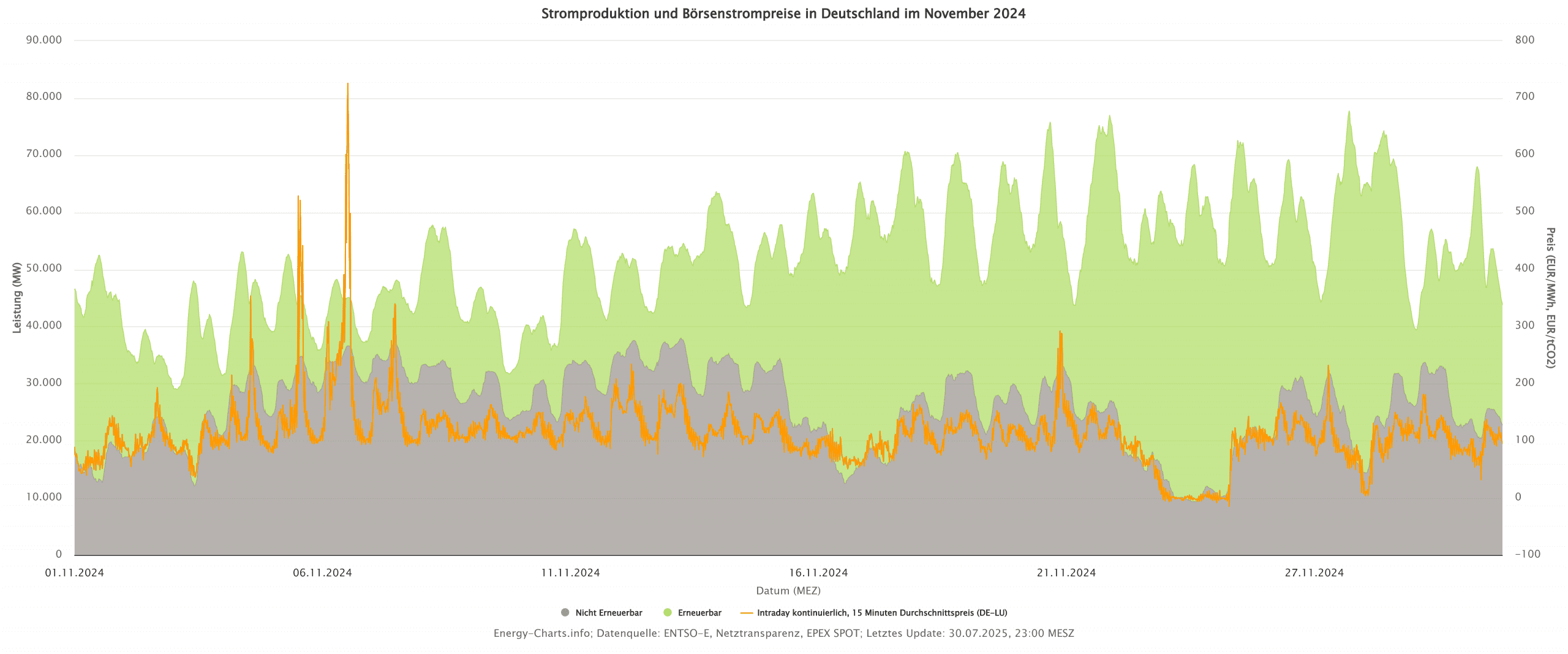 Approx. 59% of net electricity production in 2024 resulted from renewable energies, of which approx. 31.4% was attributable to wind power and approx. 13.8% to photovoltaics. However, the high proportion of non-controllable energy sources leads to fluctuations in electricity production.