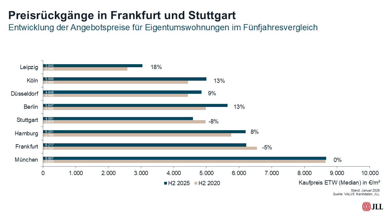 “While prices in the existing segment have fallen more sharply in recent years than in the new construction segment, where prices are less flexible due to the link to production costs, the opposite picture is now emerging in the beginning of the upswing phase with a more dynamic development in the existing segment,” says Roman Heidrich, Lead Director Residential Valuation JLL Germany, summarizing the results.