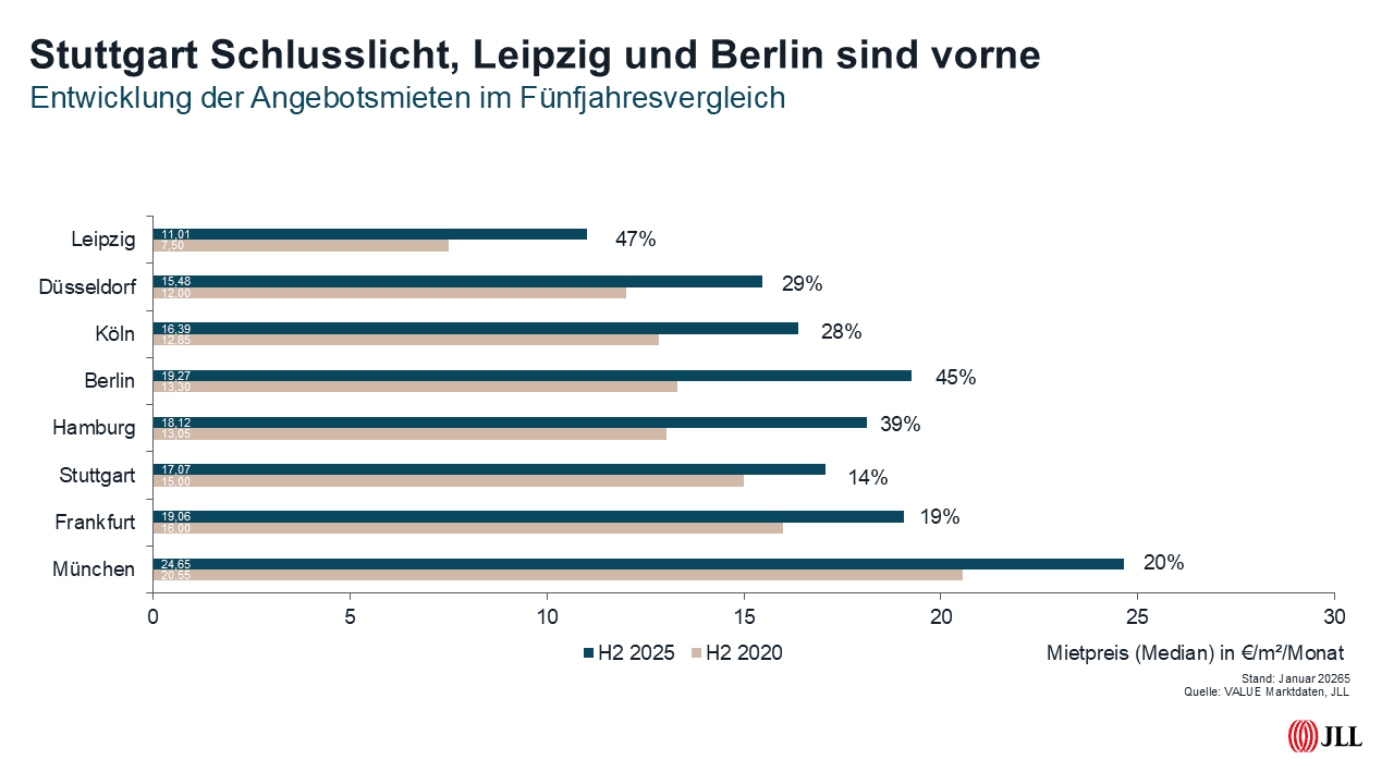 In absolute terms, Munich remains by far the frontrunner in new construction rents with a median new construction rent of 26.44 euros/m², followed by Hamburg (23.50 euros/m²), Stuttgart (22.37 euros/m²) and Berlin (21.50 euros/m²). At 14.04 euros/m², Leipzig continues to be the rental housing market with the cheapest average rents for new buildings among the cities analysed.