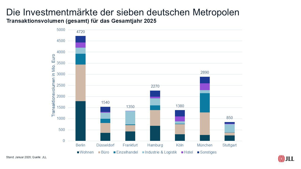 Anja Schuhmann, Branch Manager JLL Berlin & Leipzig: “With a transaction volume of 4.72 billion euros, Berlin remains clearly the number one among Germany’s real estate metropolises – even if this meant a decline of 24 percent compared to the previous year. But despite all the challenges, I see encouraging signs for 2026: We are seeing significantly more pitch activity and already a substantial pipeline. That means there will definitely be more product coming to market. And if the German economy and especially the rental markets stabilize in the coming months, I expect a positive trend. The interest in buying and the liquidity among investors are there – these are good prerequisites for a revival of the Berlin market.”