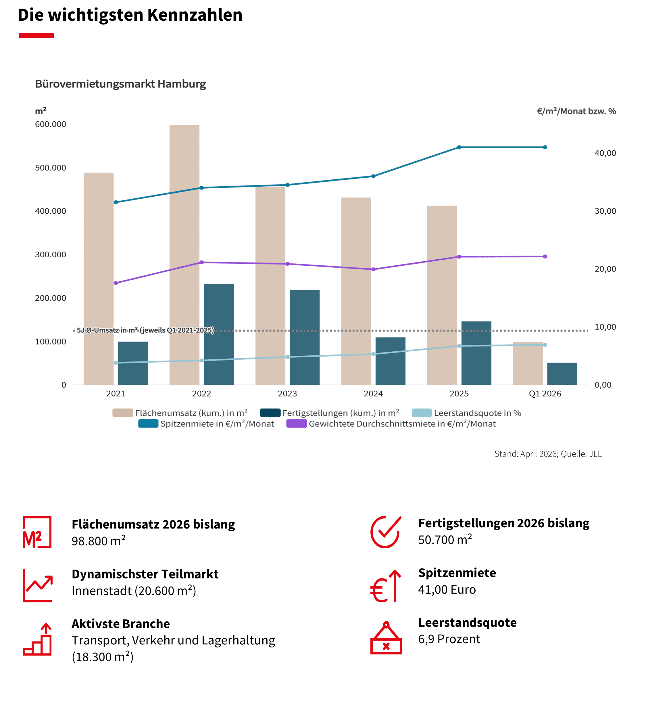 Hamburg’s office letting market got off to a rather subdued start to the year and, with 98,800 m² of take-up, missed the 100,000 m² mark for the second time in the past ten years. Compared to the previous year, this represents a decrease of 25 percent. The ten-year average was undercut to the same extent. The number of rentals also fell compared to the first quarter of 2025 – but only by ten percent to 123.