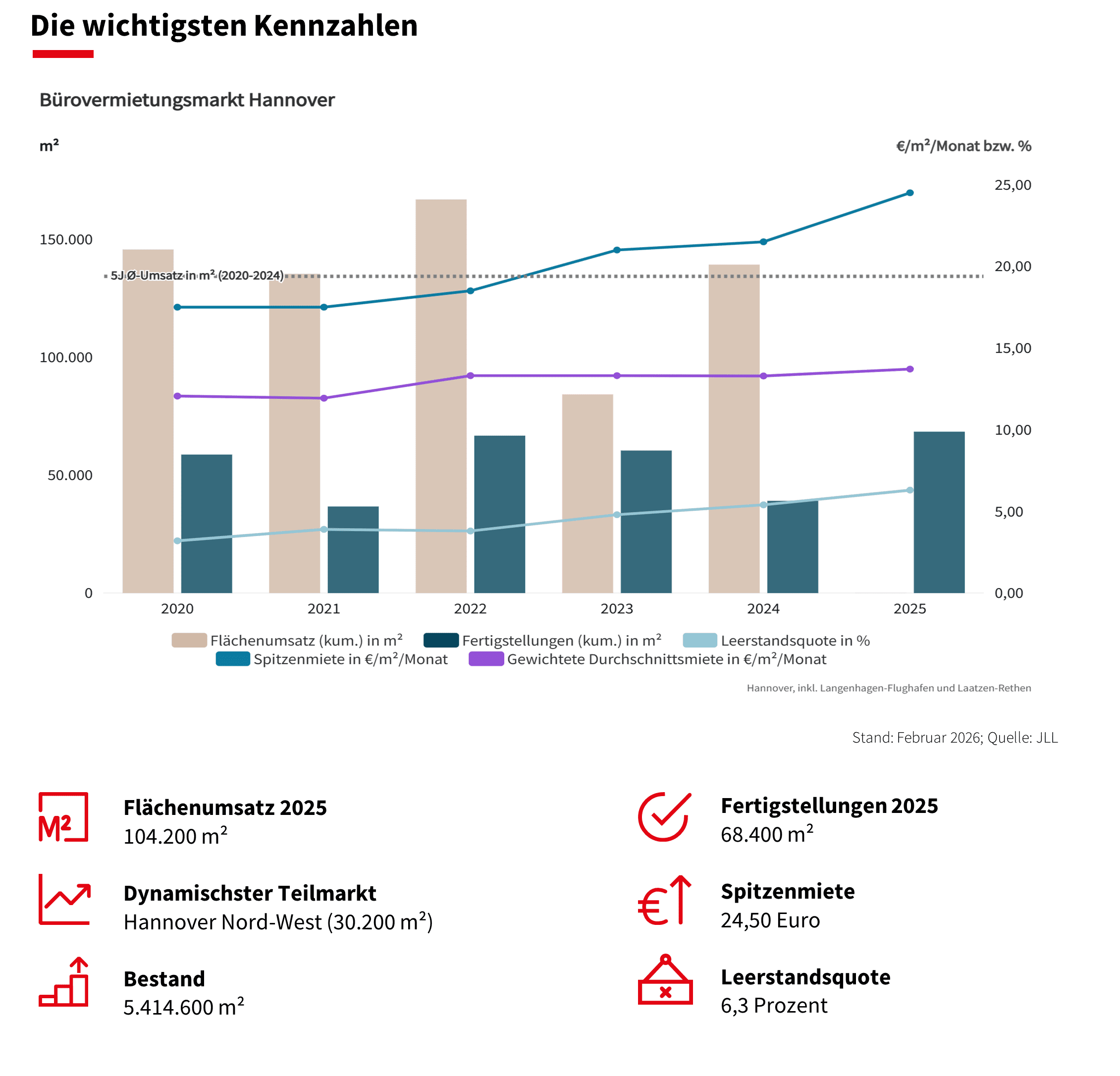 HANNOVER, 12 February 2026 – The Hanover office leasing market is reporting a mixed balance for 2025 as a whole. It is true that the prime rent rose significantly from 21.50 euros to 24.50 euros within twelve months and could rise to 25 euros by the end of the year. At the same time, however, take-up fell by 25 per cent to 104,200 m² after a strong previous year. The number of lettings also fell by 18 percent to 195, with the fourth quarter being the strongest with 69 deals. For the coming year, JLL expects an increasing market with take-up of up to 125,000 m².
