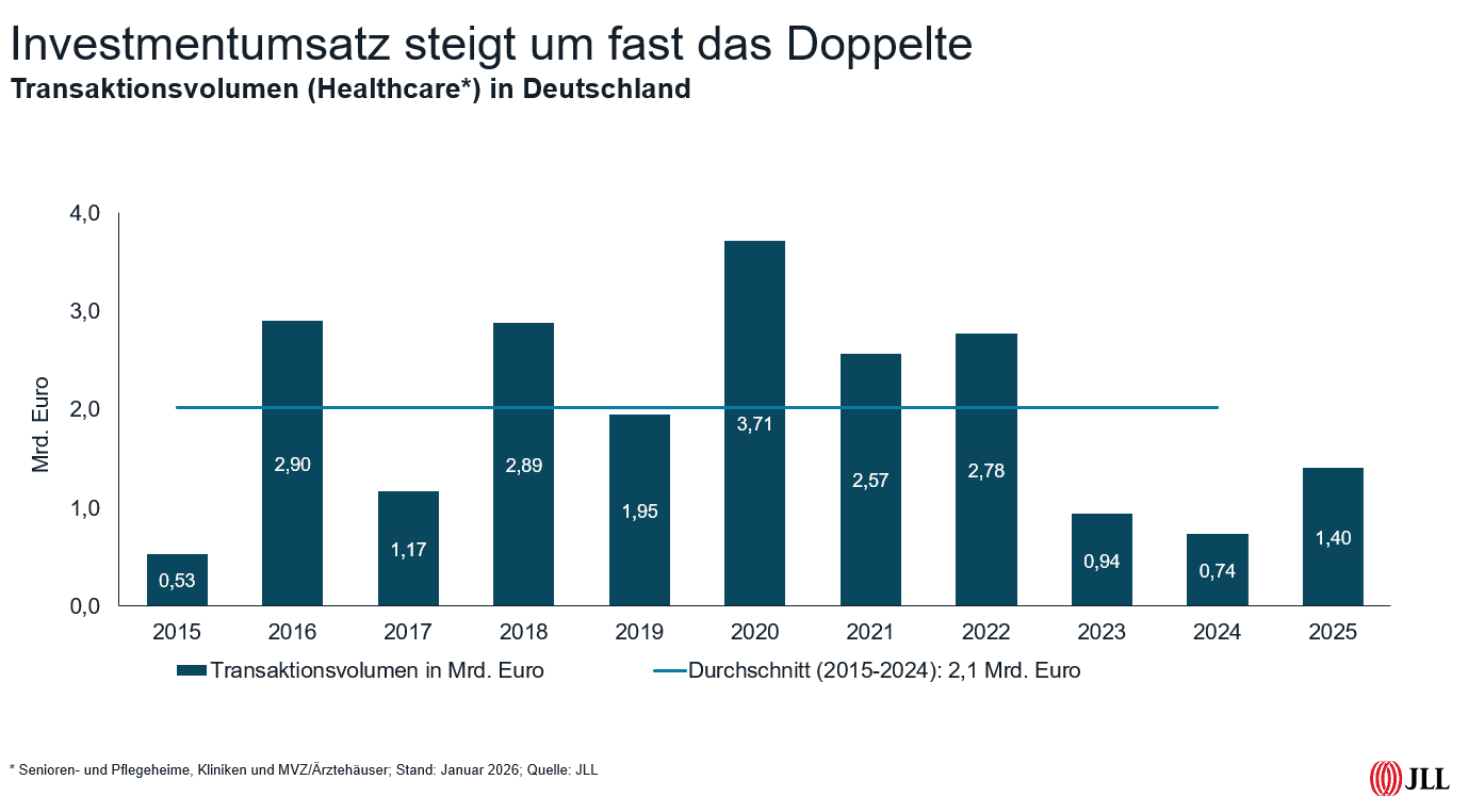 However, this has changed with the turn of the year. For example, a portfolio of 32 medical centers in Germany and the Netherlands is currently up for sale. In addition, the sale of a hospital portfolio of a similar size, which was already close to completion at the beginning of 2025 and was ultimately cancelled by the prospective buyer, could possibly still be sold. “If this portfolio were also to find a new owner, there would already be a very decent turnover in the statistics in the first months of 2026,” Tölzel calculates, drawing parallels to the previous year, when the purchase of 13 care facilities by the city of Hamburg in the first quarter of 2025 ensured a massive start to the year.