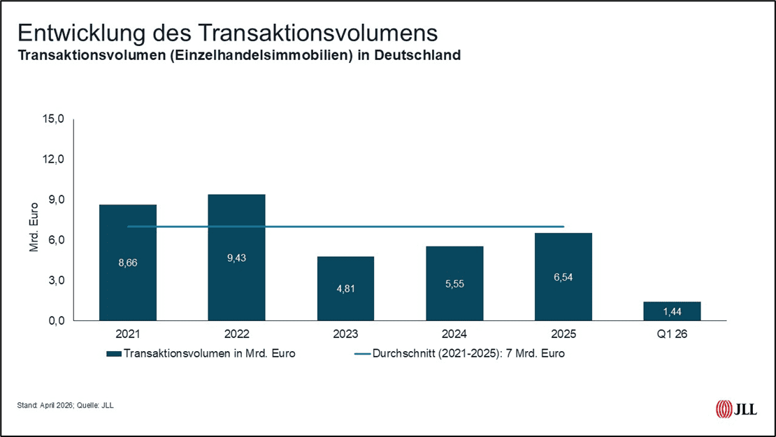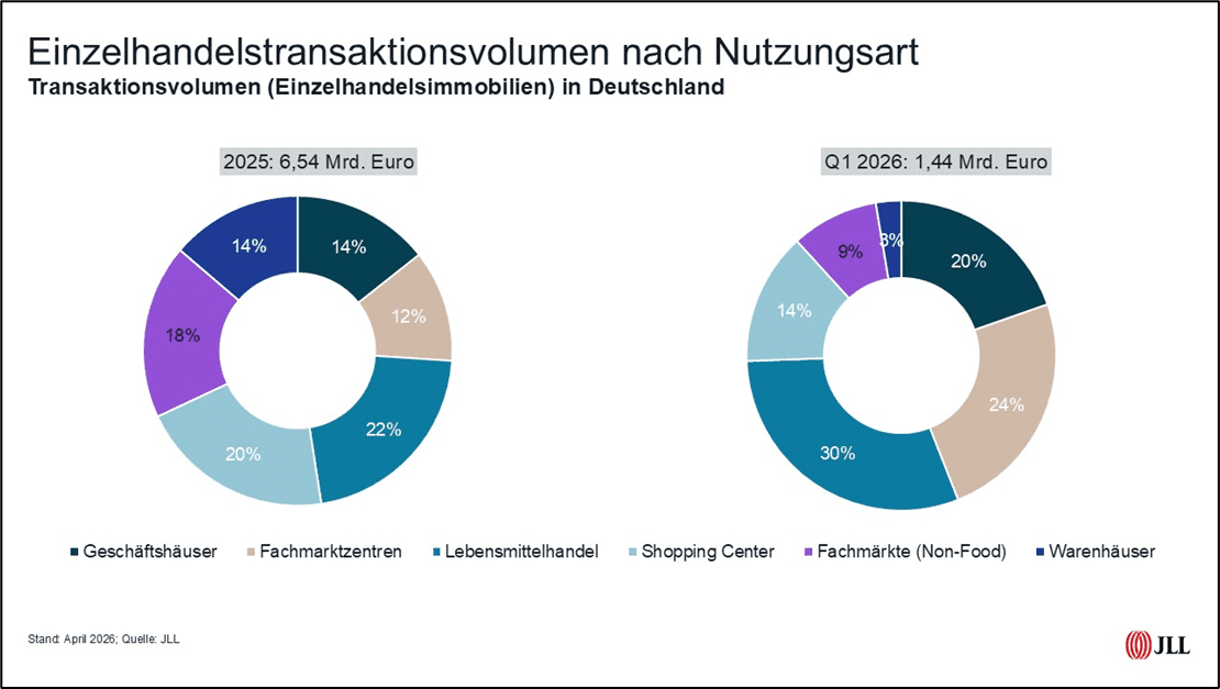 Sarah Hoffmann, Head of Retail Investment at JLL Germany: “In the first three months, we saw a very agile market in which many properties were traded across all types of use. These included numerous transactions that were already initiated in the final quarter of 2025 and have now been completed. The fact that the transaction volume was not higher is due to the fact that large deals in excess of 100 million euros were rare. Although two transactions of this size were registered, just like in the previous year, this time they achieved a total of 370 million euros, compared to 610 million euros in the previous year.”