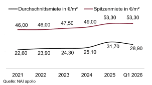 A look at the current completion pipeline shows that hardly any additional relief is to be expected for the Frankfurt office market in the coming quarters. Around 120,000 square metres of completions are planned for 2026 as a whole. Of these, 63,500 square metres are currently still available for rent. “About 40,000 square meters of this are accounted for by the Omega House in Offenbach Kaiserlei alone. In 2027, according to current knowledge, the completion volume will fall just below 100,000 square metres, of which only 18,000 square metres are still rentable. This means that the supply of modern, high-quality and ESG-capable new construction space will remain limited in the coming years,” says Angersbach. Rents have recently shown a different development. The prime rent has remained unchanged compared to the beginning of the year at 53.30 euros per square metre. Compared to the same quarter of the previous year, this represents an increase of 1.80 euros. On the other hand, there has been a normalization in the average rent. “Last year, the leasing of the entire Central Business Tower in particular led to a significant increase. However, since the rent calculations refer to the financial statements of the last 12 months, this special effect is now eliminated. As a result, the average rent has fallen to 28.90 euros per square metre and thus well below the 30 euro mark again,” explains Kanzler.