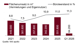 The market-active vacancy rate on the Frankfurt office market continued to rise in the first quarter of 2026. At the end of March 2026, around 1.30 million square meters will be available at short notice, which is an increase of almost 40,000 square meters compared to the previous quarter. The vacancy rate has thus increased from 11.0 percent at the beginning of the year to 11.3 percent. “While the vacancy rate in the city as a whole continues to rise, a different picture emerges in the central locations: the main CBD location remains the most sought-after location in the city for users with high demands. However, modern, high-quality and representative areas are almost completely absorbed there. In the sought-after premium properties, the vacancy rate is virtually zero,” says Preuße.