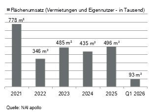 The strong growth in sublease agreements in 2025 has not yet shown a continuation in the new year. “However, the flexibly designed rental options that such contracts offer that can be implemented at short notice are still in demand and we will encounter them again in the coming months,” says Tilse. With regard to future market developments, it is difficult to make a forecast given the geopolitical risks, which are currently increasing again. “A weakening of the economic development and falling business expectations of companies will increasingly accompany new leasing decisions. At the same time, however, there are also positive impulses. Thus, there is still an increasing need for storage and logistics space in the course of the expansion of the company. Supported by several deals in the range between 10,000 and 20,000 square metres, which are currently being finalised, NAI apollo expects a sales result for 2026 again slightly below the 500,000 square metre mark and thus in the range of previous years.
