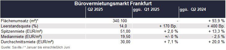 In the first half of 2025, the office letting market in Frankfurt recorded take-up of 340,100 m². This was 93.9% higher than in the first half of 2024. Compared to the 10-year average of the 1st half of the year, sales increased by 73%.