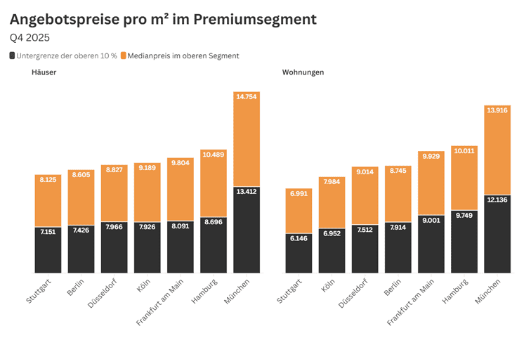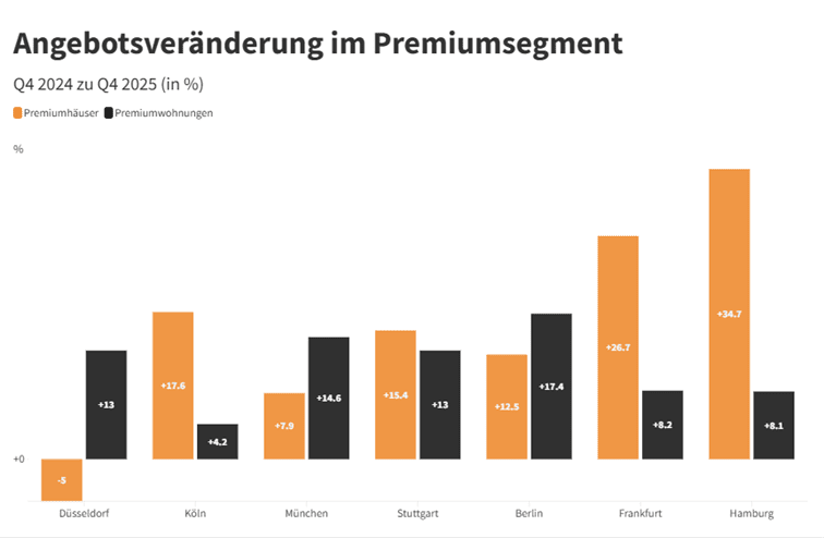 Germany’s seven most important premium real estate markets developed dynamically again in the fourth quarter of 2025: The supply of premium houses and exclusive apartments continued to rise, while negative price pressure was noticeable. This is illustrated by a recent analysis by premium real estate broker DAHLER, which examined the development of supply and demand data from Germany’s largest real estate platform, ImmoScout24, in Germany’s top 7 cities*. The premium segment of the housing market and the market for condominiums was considered, which each includes the most expensive 10% of the offers advertised on ImmoScout24.