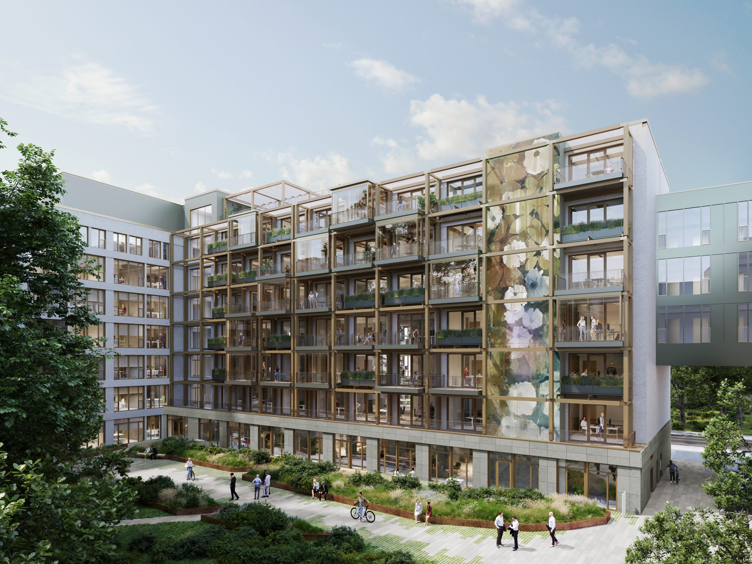 The existing Berlin project “Karlsgärten” by the client CA Immo from the 1990s is an example of how this principle works: The structural concept of the architects of AUKETT + HEESE relies on the preservation of the shell structure as an essential lever for the reduction of grey energy, as well as on targeted structural interventions such as adding storeys in timber hybrid construction, activating roof areas, and adding private balconies on each floor. These measures generate an increase in 2,700 square metres of rental space – a clear economic added value.