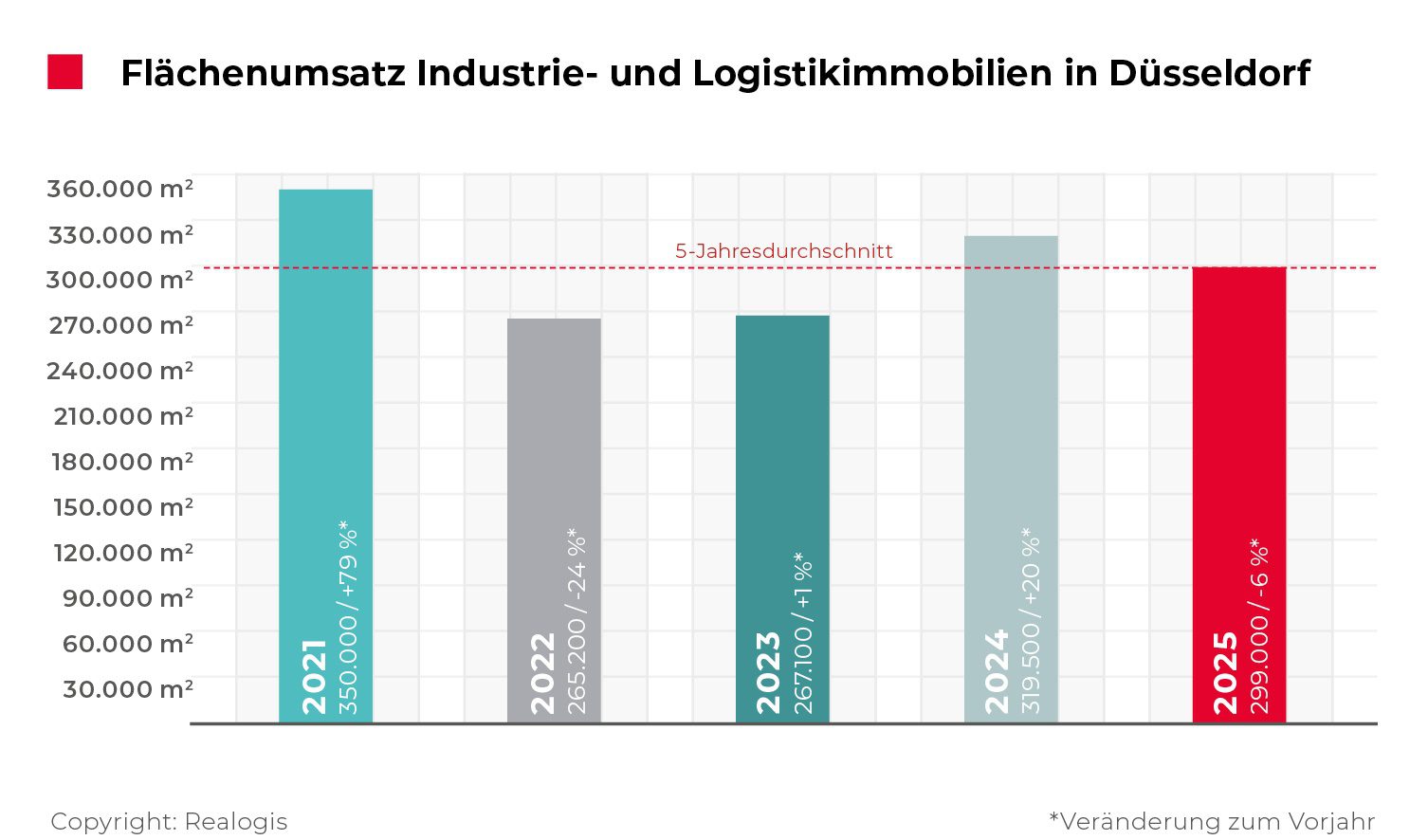 The REALOGIS Group, Germany’s leading consulting firm for industrial and logistics real estate as well as commercial properties, registered take-up of 299,000 m² in the Düsseldorf industrial and logistics real estate market in 2025 as a whole. Compared to the previous year, this corresponds to a decline of 20,500 m² or 6% (2024: 319,500 m²). This meant that the result was almost at the level of the 5-year average of 300,160 m².
