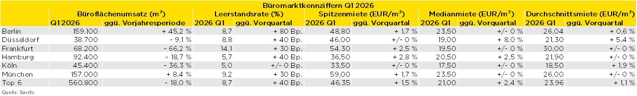 Jan-Niklas Rotberg observes: “Away from the top segment, many users are currently experiencing a much more relaxed market. The shift in demand towards higher quality and central locations means that peripheral and less competitive stocks are becoming less attractive and vacancies are rising. In these properties, users often have a strong negotiating position when renewing contracts, which is reflected in flexible terms and attractive incentives. Many companies therefore extend existing contracts in order to gain time to clarify costs, expansion and future space requirements. Overall, the increasing focus on quality is reinforcing the segmentation of the market.” The rising prime rents combined with increasing vacancies illustrate an increasing market polarization. On average, the prime rent was higher than the top rent. -6 cities increased by 1.5% quarter-on-quarter, while the vacancy rate rose by 40 basis points to 8.7%.