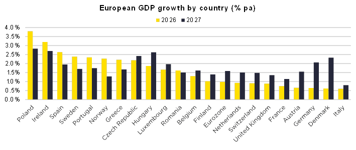 This is closely related to the latest forecasts for GDP growth in Europe. Oxford Economics expects GDP growth in the eurozone to reach 1.0% in 2026 and 1.6% in 2027. Across Europe, the economies of Central and Eastern Europe and Southern Europe are expected to record the strongest GDP growth in 2026, driven by stronger domestic demand and investment. The economic outlook for Western Europe is expected to improve significantly next year. For example, GDP growth of over 2% is expected for Germany in 2027.