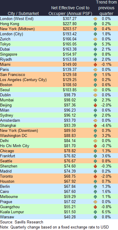 Rick Schuham, CEO of Global Occupier Services at Savills, comments: “In recent years, an increase in the cost of prime office space in many markets has been largely driven by rising fit-out costs, as inflation in labour and building materials has driven up prices. As the expansion costs are now stabilizing, the cost increases in the third quarter were mainly caused by rising rents. Worldwide, the picture is largely characterised by a very limited supply of first-class space in combination with increased and growing demand from users. This gives landlords the opportunity to raise rents.”