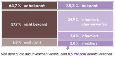 57.9 percent of those surveyed state that they are not aware of the possibility of purchasing individual nursing apartments as an investment. A further 6.8 percent are unsure about their level of knowledge. This means that around 35 percent of potential investors are aware of the investment opportunity. And a total of 10.4 percent say they know the investment option – and either do not rule it out or are even already invested. Accordingly, 8.5 percent of those who know the investment are even already invested. In combination with the large proportion of investors who are not yet aware of the investment, this results in significant market potential.